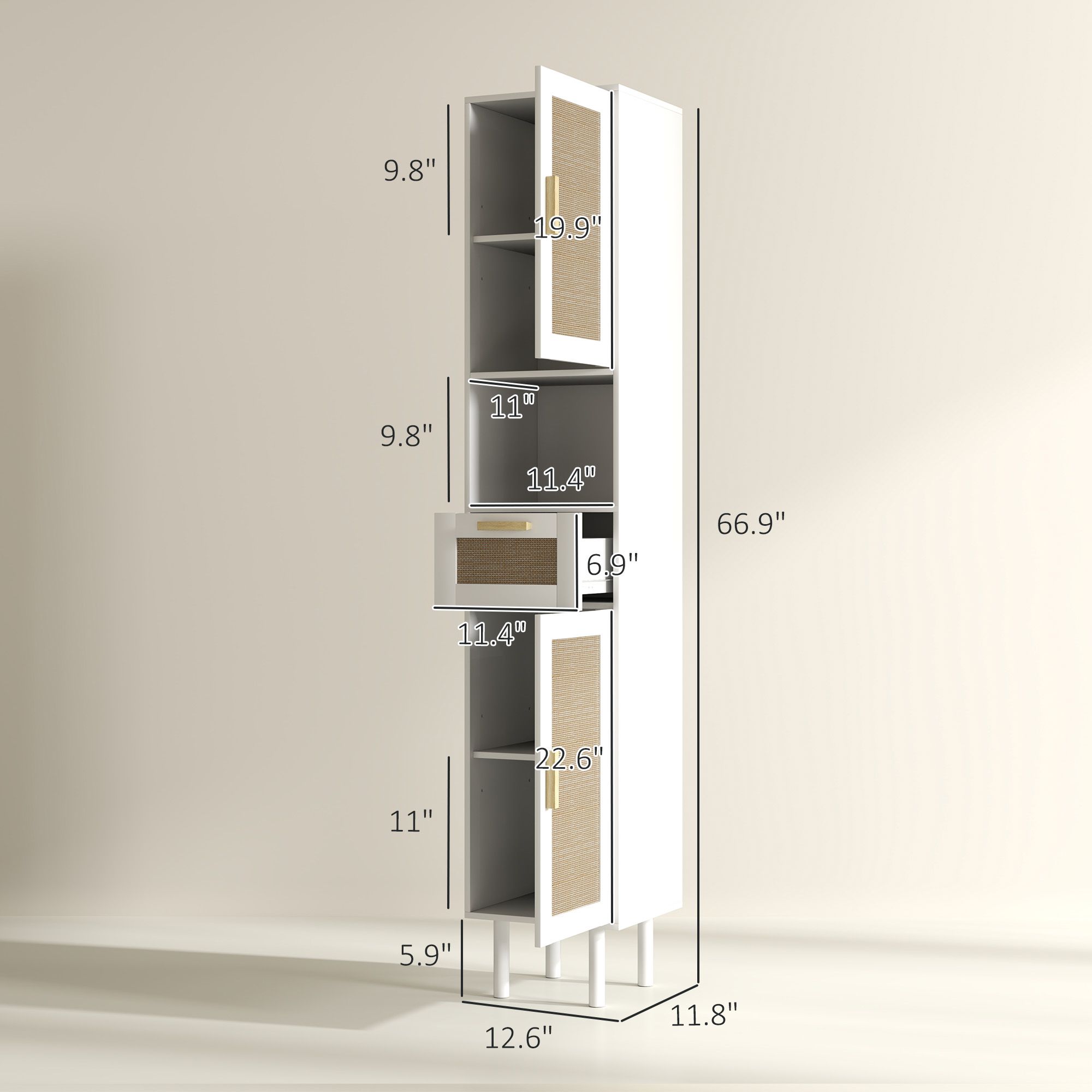 HOMCOM 67" Tall Bathroom Storage Cabinet, Freestanding Narrow Cabinet w/ Rattan Doors & Adjustable Shelves, White