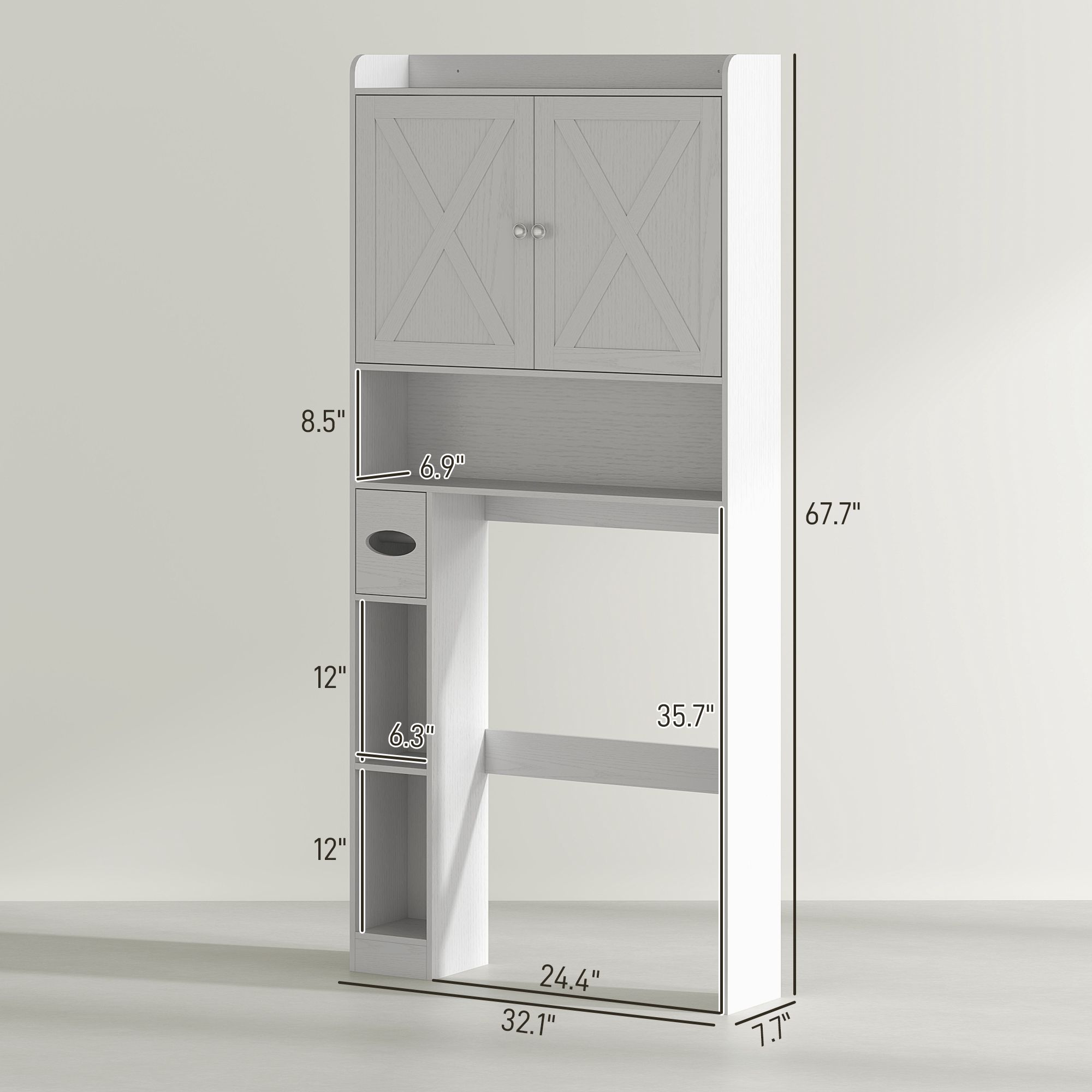 4.- Space-Saving Design: Measuring 32.1" x 7.7" x 67.7", this above toilet storage cabinet is designed to provide efficient storage without consuming excessive floor space.
